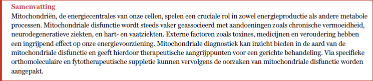 Neurologische, metabole, oncologische aandoeningen en hartziekten worden steeds vaker geassocieerd met een mitochondriale disfunctie. Aangezien mitochondriën hoofdzakelijk verantwoordelijk zijn voor de energieproductie, heeft een disfunctie voornamelijk invloed op het prestatievermogen. Met name de sterk energieafhankelijke weefsels, zoals het zenuwstelsel, het hart en de spieren, zijn afhankelijk van een voldoende energievoorziening vanuit de mitochondriën.1,2 Vanwege het veelvuldig voorkomen en de complexiteit van mitochondriale disfunctie is adequate diagnostiek op zijn plek.