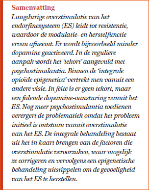 Een verminderde gevoeligheid (resistentie) van het endorfinesysteem is een belangrijke factor in het ontstaan van chronische aandoeningen. Resistentie komt door overstimulatie van het endorfinesysteem. Een belangrijke oorzaak van overstimulatie is troostvoeding. De belonende en rustgevende effecten ervan worden veroorzaakt door het activeren van endorfine, dopamine en GABA. Vooral suiker, smaakversterkers en exorfinen – voedingsopiaten in gluten, zuivel en soja – hebben dit effect. Met het behandelmodel van de ‘integrale epigenetica’ stellen we het lichaam in staat om zelf de ES-functie te herstellen.