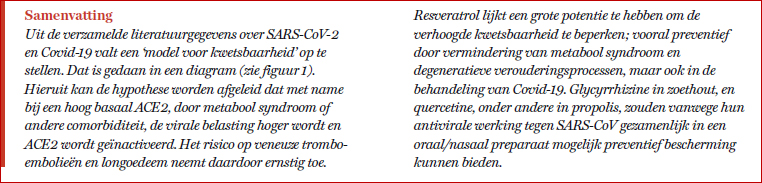 Waarom is Covid-19 geëxplodeerd tot een pandemie? Om dat te kunnen begrijpen moeten we twee vragen beantwoorden. Wat is er specifiek aan dat wat SARS-CoV-2 teweegbrengt? En welke gastheerfactoren beïnvloeden het beloop van de ziekte? We kijken daarvoor naar zes factoren: virusbinding aan ACE2, RAS-balans, gewicht, geslacht, leeftijd en comorbiditeit. We brengen ze samen in een ‘kwetsbaarheidsmodel’, waar we conclusies aan verbinden. En bij elk van de factoren noemen we natuurlijke middelen met een mogelijke therapeutische rol.