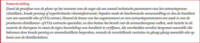 Kiezen voor kwaliteit betekent oog hebben voor uiteenlopende aspecten die grotendeels als objectieve parameters geformuleerd kunnen worden. De ervaren aromatherapeut kan de keuze van extracten verfijnen door aandacht te besteden aan het productieproces, van oogst tot extractie. Zowel de groeifase van de plant op het moment van de oogst als een aantal technische parameters van het extractieproces (distillatie, koude persing of superkritische vloeistofextractie) bepalen mede de biochemische samenstelling, en dus de kwaliteit van een aromatisch plantenextract. Dit artikel bespreekt objectieve criteria voor de beoordeling van de kwaliteit van essentiële oliën (distillatie en koude persing) en CO2 extracten, afkomstig van één plantensoort.
