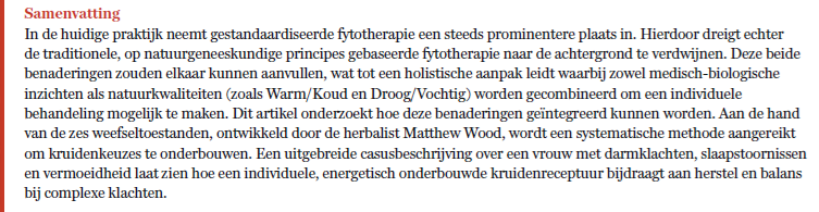 De moderne gestandaardiseerde fytotherapie heeft een belangrijke plaats in de praktijk en de behandelaar kan kiezen uit vele waardevolle fytotherapeutica die met klinisch onderzoek worden ondersteund. Met dit succes lijkt echter haar oorsprong, de traditionele fytotherapie ondersteund door natuurgeneeskundige principes, steeds meer naar de achtergrond te verdwijnen. Hiermee dreigt de individualiteit van de zieke mens uit het zicht te raken en het persoonsgerichte kruidenrecept plaats te maken voor gestandaardiseerde fytotherapeutica. Hoe waardevol de gestandaardiseerde fytotherapeutica ook kunnen zijn, dit is een gemis, want beide invalshoeken kunnen elkaar aanvullen en de behandeling naar een hoger plan tillen.