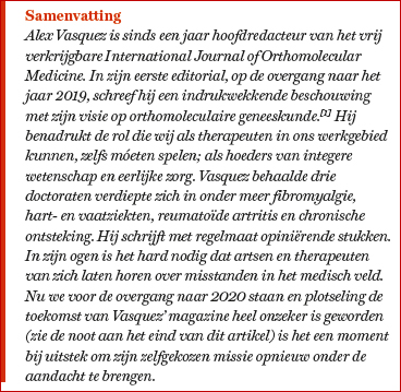 Kenmerkend voor Alex Vasquez zich is dat hij bij al zijn reacties consequent verwijst naar wetenschappelijk onderzoek en dat hij eigen onderzoek ook altijd ondersteunt met degelijk wetenschappelijk onderzoek. Zoals zijn conclusie dat een deel van onze medicijnen en vaccins geen ziektes oplossen. In het beste geval richten ze geen schade aan; vaak echter wordt de ziekte verergerd, onder meer door bijwerkingen, waardoor weer meer pillen nodig zijn. ‘De oplossing is echter eenvoudig’, zegt hij. ‘Zorg dat mensen gezond gaan eten, bewegen, zin krijgen in het leven en je lost heel veel ziektes op.’ Daar heeft hij verschillende modellen voor ontworpen op een voor studenten en patiënten gemakkelijk toegankelijke wijze.2