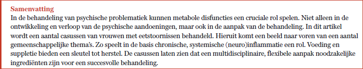 Metabole psychiatrie is een opkomend concept dat zich richt op de integratie van metabole processen in de behandeling van psychiatrische stoornissen. Het uitgangspunt is dat biochemische onevenwichtigheden, voedingsfactoren en metabole disfuncties een cruciale rol spelen in de ontwikkeling en het verloop van psychische aandoeningen. In dit artikel wil ik illustreren dat er een plaats is voor een integratieve benadering in de behandeling van psychiatrische problematiek, zoals eetstoornissen, met name bij patiënten met een voorgeschiedenis van chronische systemische inflammatie, neuro-inflammatie, darmproblemen, voedingsdeficiënties en andere metabole disfuncties.
