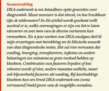 Middels bloedonderzoek of een organische-zurentest kunnen allerlei knelpunten in de stofwisseling worden ontdekt. Soms echter komt er weinig relevants uit, en soms ook blijft de oorzaak onduidelijk. Met een DNA-onderzoek kan men dieper op de biochemie inzoomen, waardoor mogelijk de vinger precies op de zere plek kan worden gelegd. Daarna kan men gericht zoeken naar strategieën om knelpunten te omzeilen of te compenseren. Niet elke aanbieder van DNA-rapportages voorziet hier voldoende in, maar in potentie kan zo’n rapportage dit wel bieden.