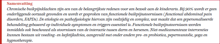 Wereldwijd komen functionele buikpijnklachten veel voor. Bij kinderen resulteert functionele buikpijn in significante beperkingen in hun dagelijks leven, waaronder schoolverzuim en verminderde kwaliteit van leven. De etiologie en pathofysiologie zijn nog niet geheel duidelijk. Vele factoren, waaronder de darm-hersenas spelen een belangrijke rol. Er wordt steeds meer onderzoek gedaan naar de rol van voeding en niet-medicamenteuze complementaire behandelopties. Dat is belangrijk omdat 90% van de kinderen met functionele buikpijn aangeeft dat een of meer voedingsmiddelen geassocieerd zijn met een toename van de buikpijnklachten. 40% van de Nederlandse kinderen met functionele buikpijn zoekt hulp bij een complementaire behandeling met bijvoorbeeld kruiden en andere voedingssupplementen.