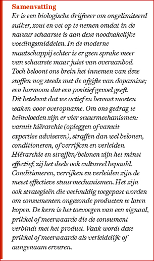 Veel van het voedsel dat wij vandaag de dag als ongezond beoordelen – vet, suikers en zout – zijn juist de bestanddelen die in de natuur slechts beperkt of tijdelijk beschikbaar zijn. Als er kans op schaarste is zie je dat we er biologisch op geprogrammeerd zijn om onmiddellijk reserves aan te leggen. Dopamine is de stof in ons lichaam die dit reguleert en een keten van reacties in gang zet die de opname van dit soort voedsel beloont. We worden als het ware gestimuleerd om meer op te nemen dan nodig: een biologisch overlevingsmechanisme voor tijden van schaarste.