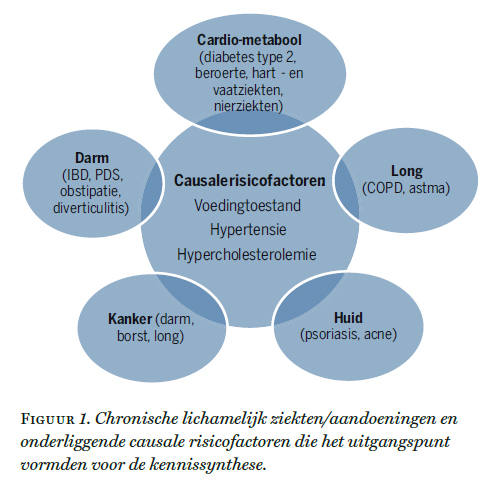 De kennissynthese brengt enerzijds, op basis van een dossierstudie, de positie van voeding in behandelrichtlijnen in kaart. Hiertoe werden de beschikbare (inter)nationale behandelrichtlijnen met betrekking tot cardiometabole, long-, darm- en huidziekten, en kanker gescreend. Primair betrof dit richtlijnen voor artsen. Anderzijds is met 32 Nederlandse experts gesproken over de door hen meest kansrijk geachte voedingsinterventies en hun bewijskracht in relatie tot voornoemde chronische ziekten.