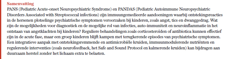 PANS en PANDAS zijn auto-immuunziekten met een psychiatrische presentatie. PANDAS is specifiek gelinkt aan een streptokokkeninfectie. PANS is breder en kan worden uitgelokt door andere infecties zoals Mycoplasma, Epstein-Barr of Borrelia, maar ook door stofwisselingsstoornissen, schimmels, toxines of andere omgevingsfactoren.1 Kenmerkend is de plotselinge, vaak dramatische toename van symptomen als dwanggedachten, motorische tics, regressie, en bovenal: angst. Vooral separatieangst is bijna universeel aanwezig. Deze immuuncomponent suggereert dat een belangrijke aanpak van de aandoening gericht moet zijn op het herstel van de immuunbalans en het bestrijden van de infectie.