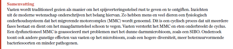Vasten wordt al millennia in vele culturen en religies toegepast.1 In traditionele geneeswijzen wordt vasten gezien als manier om het spijsverteringssysteem rust te geven en te ontgiften. In religieuze tradities staat het bekend als middel tot bezinning, zelfdiscipline en het versterken van de band met het goddelijke. Pas enkele decennia is bekend hoe groot de rol van het darmmicrobioom en in het bijzonder vasten voor onze gezondheid is. In dit artikel schets ik hoe de traditionele visie op vasten aansluit bij de moderne kennis hierover in relatie tot het microbioom en het migrerende motorcomplex in de darm.