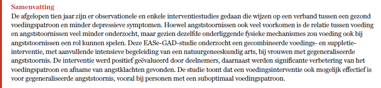 Het laatste decennium is in observationele studies een duidelijke relatie aangetoond tussen een gezonder voedingspatroon en een lagere prevalentie van depressieve symptomen en stoornissen.1 Dit geldt ook voor enkele interventiestudies waar het mediterrane dieet positieve effecten laat zien bij personen met een gediagnosticeerde depressie.2 Er is echter beduidend minder onderzoek gedaan naar het verband tussen voeding en angststoornissen, terwijl die wereldwijd vaker voorkomen. Om de potentiële effecten van een voedingsinterventie bij gegeneraliseerde angststoornis te onderzoeken, is de Eating and Supplementation for Generalized Anxiety Disorder study (EASe-GAD) opgezet. In dit artikel gaan we in op de opzet en bevindingen van deze studie.